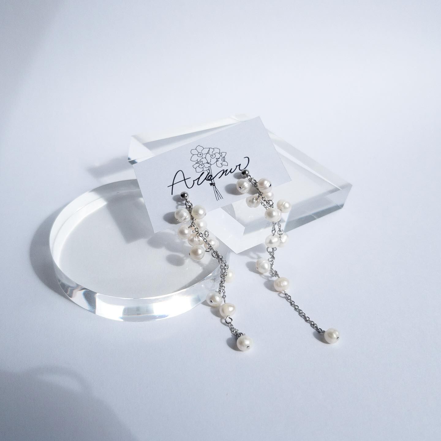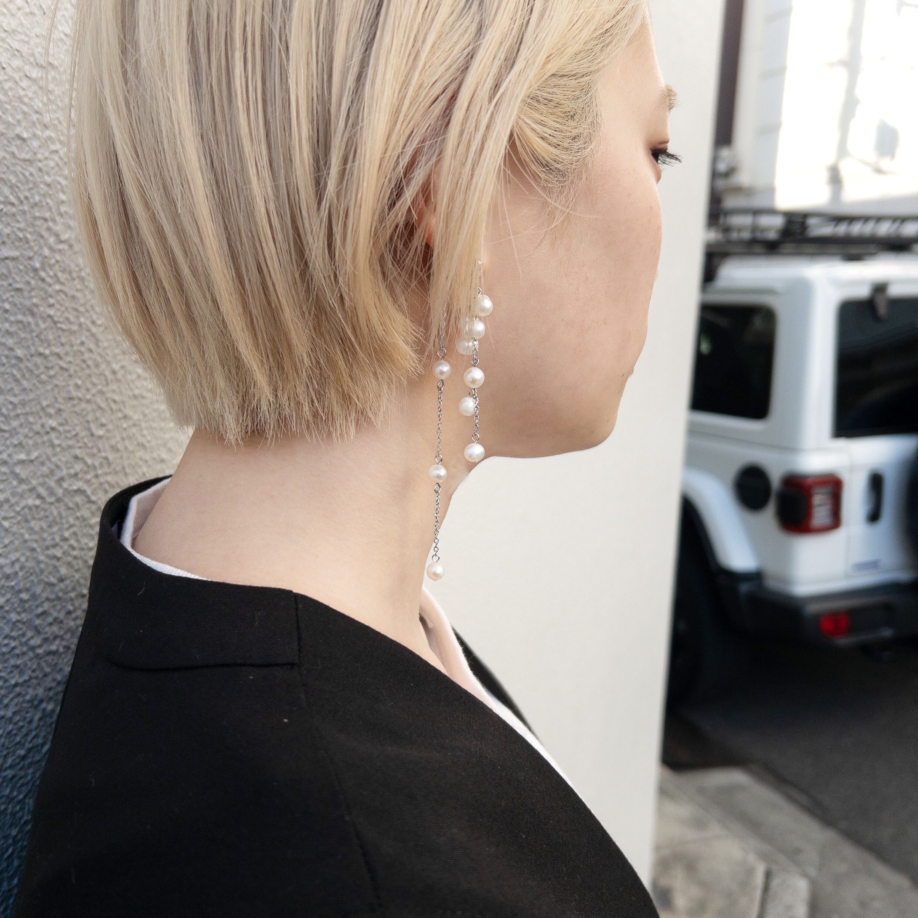 2本のシルバーチェーンにふんだんの淡水パールを使用したピアスとなります。